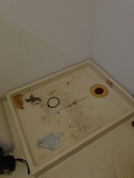 集合住宅のご自宅で洗濯パンを交換したいとの事でした。既設の洗濯機がすっぽりハマって脱水の際音がうるさいとの事でした。実際に洗濯機を退かすと洗濯パンが割れておりました。