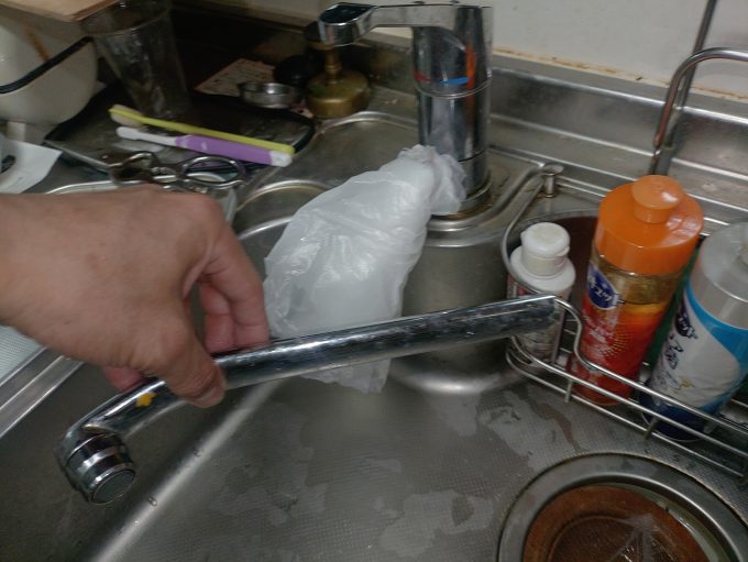 お客様へ説明し、使用年数も25年経っていることから蛇口の部品もないので、今回は蛇口自体の交換となりました。