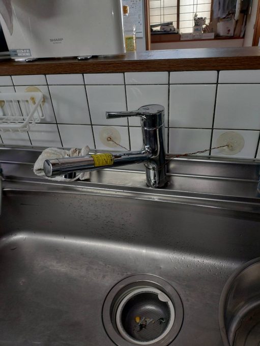 お伺いしお話しをお聞きしますと、「別業者にて蛇口交換をお願いしたが、交換するのに12時間以上経っても終わらず、デタラメな施工だったので途中で帰ってもらった。どうにかきれいに取付られないか。」との事でした。