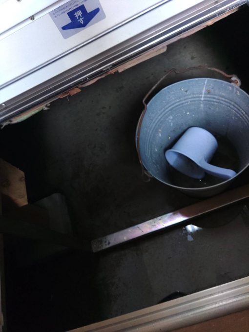 お伺いしますと、お客様から「床下に水が溜まって」と言われながら案内されますと、床下収納の蓋が外され床下浸水状態になっていました。