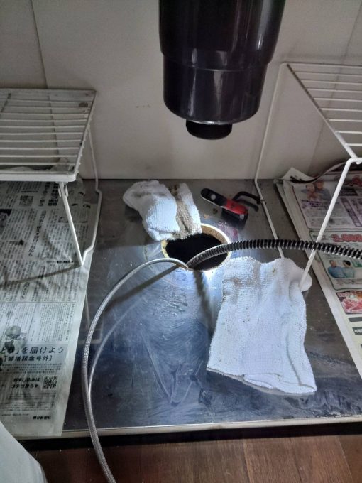 奥様が以前詰まったからと排水管に棒を突っ込んだら流れるようになったとのことでしたが、実際詰まりを奥に押しやっただけで抜けておらず、溢れた汚水が床下に流れているだけでした。