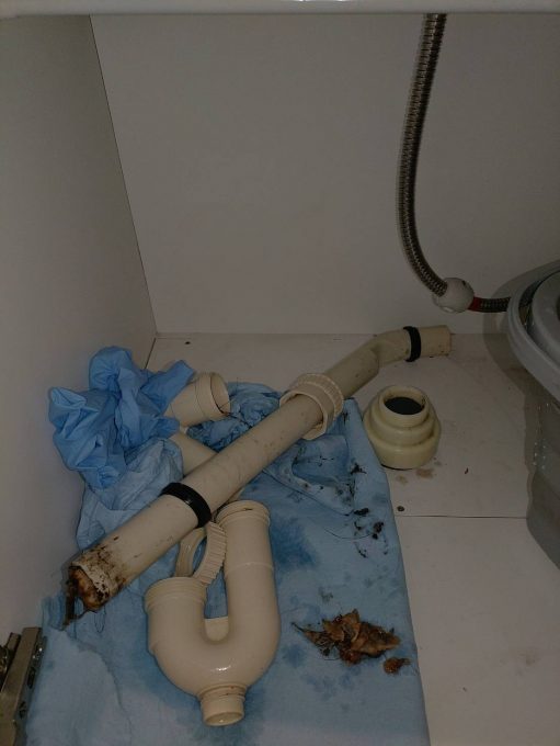 お客様が落としたキャップを取り除くために、排水管を一度すべて取外していきます。キャップを取り除き丁寧にもとに戻して作業終了です。最後に水漏れの確認も行います。