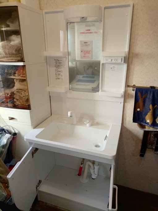 点検をさせて頂きますと、蛇口の給水ホースからの水漏れと、止水栓からの水漏れが確認できました。お客様に現状をお伝えしますと、30年くらい使っているし、洗面ボールもヒビが入っているから洗面化粧台ごと新しいのにしたいとのことで、新しい洗面化粧台に交換をさせて頂くことになりました。