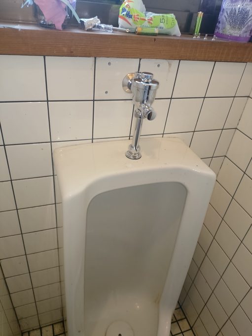 お伺いしトイレを点検させていただくと、小便器のフラッシュバルブが全く反応がなく、常に便器に向けて水が流れている状態でした。